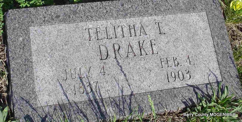 | DRAKE, Telitha Temperance (YOUNG) (COMBS) | July 4, 1837 | Feb. 4, 1903 | Research Note: Wife of Jacob Drake. Their daughter's death certificate, Amanda Caroline (Drake) Riggs, buried at Arnhart Cemetery, gives her mother's maiden name. - Bio by: Darrell and Joan Mansur - She was the daughter of Robert Coleman Young and Elizabeth (Patterson) Young and married 1st, Columbus M. Combs, abt. 1855 and had two children, William Carell and Tennessee Angeline Combs, and 2nd, as his 2nd wife, Pvt. Jacob Drake, Jr. (1824-1895) on Dec. 30, 1860 and had five children, Mary Elizabeth, Jacob Young, Ruthy E., Elijah C. and Nancy T. Drake. - Telitha Temperance Young married Columbus M. Combs in 1855, in AR. Columbus died in 1860 in Kingston, Madison Co., AR. Married to Jacob Drake by the 1870 census. | Note Int'l Marriage Records Census Phyllis Long Photo Donna Cooper |
