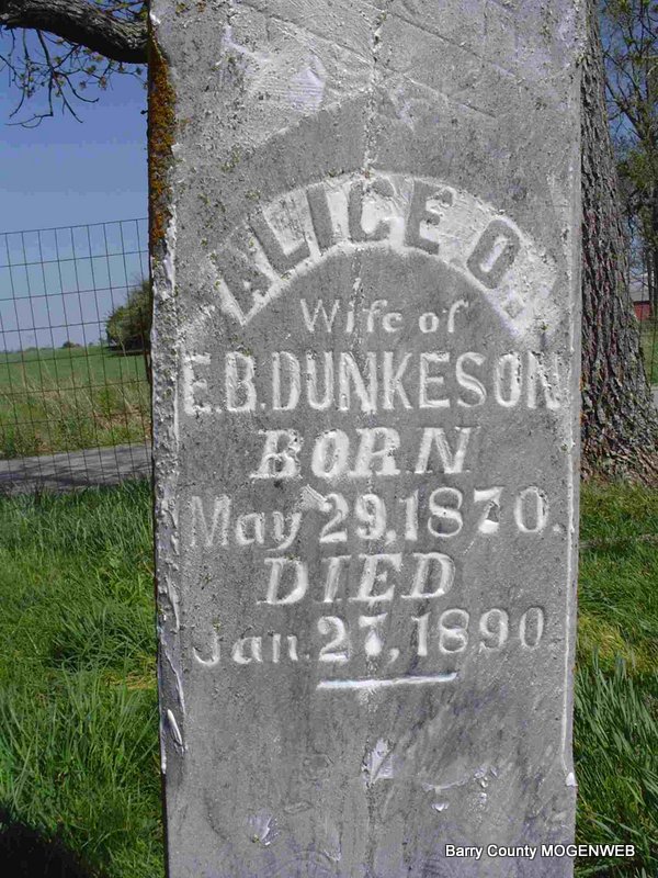 | DUNKESON, Alice Ophelia (LANE) | May 29, 1870 | Jan. 27, 1890 | Research Note: Wife of E. B Dunkeson. E. B. Dunkerson/Dunkeson married Ophelia Lake on Feb. 14, 1889 in Barry Co., MO. - Donna's note: She was a wife of Edward Bernard Dunkerson. She was a daughter of Wilson and Eliza (Long) Lane and a granddaughter of Hiram and Anna Long. | MO Marriage Records Phyllis Long Note Photo Donna Cooper |