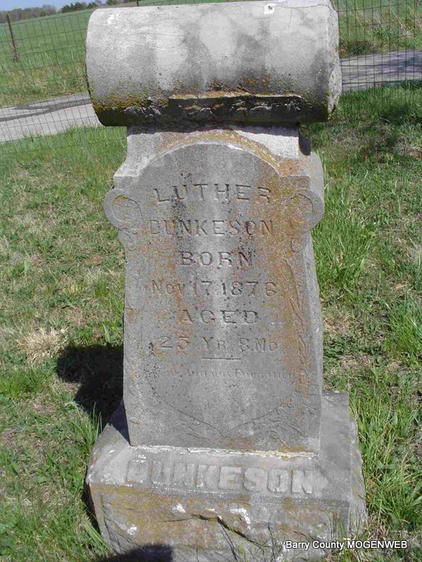 | DUNKESON, Thomas Luther | Nov. 17, 1876 | Abt. 1901 | Inscription: "Died at age 25 years 8 months" - Research Note: Son of Thomas Lyman Dunkeson and Mary Jane Williams. | Census Phyllis Long Photo Donna Cooper |
