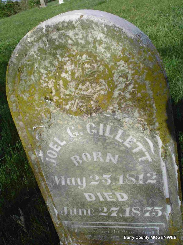 Research Note: Joel Gillett was married to Nancy Ann Radford in 1833 in Lawrence County MO. He was the 6th child (3rd son) of Joel and Chloe "Cloa" (Griswold) Gillett. He was the father of at least 4 children - Reverend Alanson Ross, William E., Sarah C. and Benson Owen. | Note Bill Gillett Photo Donna Cooper |