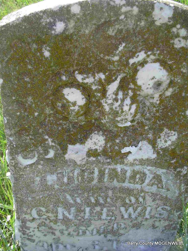 | LONG, Lavina (BELLAH) | Aug. 19, 1827 | May 30, 1906 | Research Note: Lavina Bellah, wife of John Dake Long. Lavina was the third great grandmother of Donna Cooper. Lavina Bellah married John D. Long on July 9, 1846 in Oregon Co., MO. - June 9, 1906, Cassville Democrat - Purdy News: Mrs. Long, mother of Hiram Long, died last week, age 76 years. - Lavina (Bellah) Long, died May 30, 1906, she was the wife of John Dake Long and was buried at Maddy Cemetery. Her stone reads that she was born in August 29, 1827, which would have made her 79 years old and not 76 as the newspaper read. Her husband and his father, Hiram, were killed during the Civil War by bushwhackers. - His estate reads: Page 145, Letters of Administration, Barry Co., MO. George Long, Lenard Long, John D. Long, Simon H. Long, Kizah Long and Samantha Long, minor heirs of J. D. Long, deceased. Bond: $ 200., 30 March 1867, William Cannon, Administrator, William W. Lee and Thomas Smith, bondsmen. It is not known where Hiram and John Dake Long are buried but presumed at Corsicana, because Maddy may not have been a cemetery that early. If it was then they are probably at Maddy. - Footstone - Could be a footstone for Lavina. - Another Photo | Online Newspapers MO Marriage Records Phyllis Long Note Photos Donna Cooper |