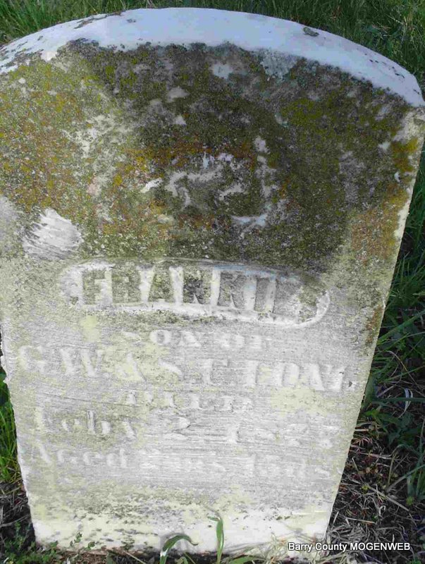 | CLARK, Julia B. | Sept. 5, 1861 | May 28, 1880 | Research Note: Daughter of W. S. and F. E. Clark - 1870 Census, Shoal Creek, Barry, Missouri - Franklin Clark, age 36, born KY; Susan, age 27, born TN; Julia, age 9, born TN; James P., age 2, born TN. | Census Phyllis Long Headstone Donna Cooper |