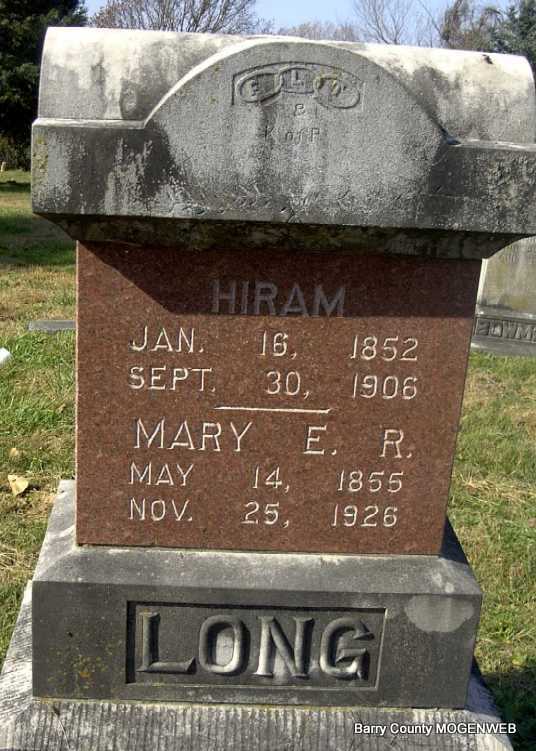 | LONG, Hiram | Jan. 16, 1852 | Sept. 30, 1906 | SSW: Mary E. R. (Davis) Long - Research Note: Son of John Dake Long and Lavina Bellah. His father and grandfather were killed in the Civil War by bushwhackers. - October 6, 1906, Saturday, Cassville Democrat - Hiram Long suffered a relapse with typhoid fever and was very low at last account. - Photo of Hiram Long Family | Online Newspapers Census Phyllis Long Photo Donna Cooper |