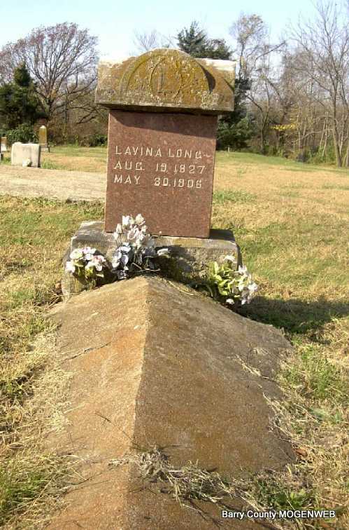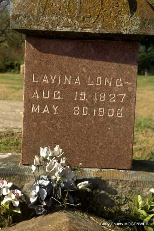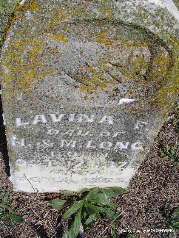 | LONG, Lavina F. | Oct. 17, 1871 | Oct. 4, 1885 | Inscription: "Dau. of H. and M. Long" - Research Note: 1880 Census, Shoal Creek, Barry, Missouri - Vina Long, age 51, born AR, parents born TN; Hiram, age 28, boarder (son), widowed, born MO, age 28, farmer, born MO, father born IN, mother AR; Samantha J., daughter, divorced, age 19, born MO, father born IN, mother AR; Lavina F., granddaughter, age 8, born MO, father born MO, mother AR; Jerry A. B., grandson, age 1, born MO, both parents born MO. - From this census, Hiram must have had a first marriage and had Lavina F. The 1900 census shows him married to Mary Elizabeth Rebecca Davis for 19 years, making the marriage year 1881. Of course, married 19 years might not be correct and Lavina belong to another of Vina Bellah's sons. | Census Phyllis Long Photo Donna Cooper |