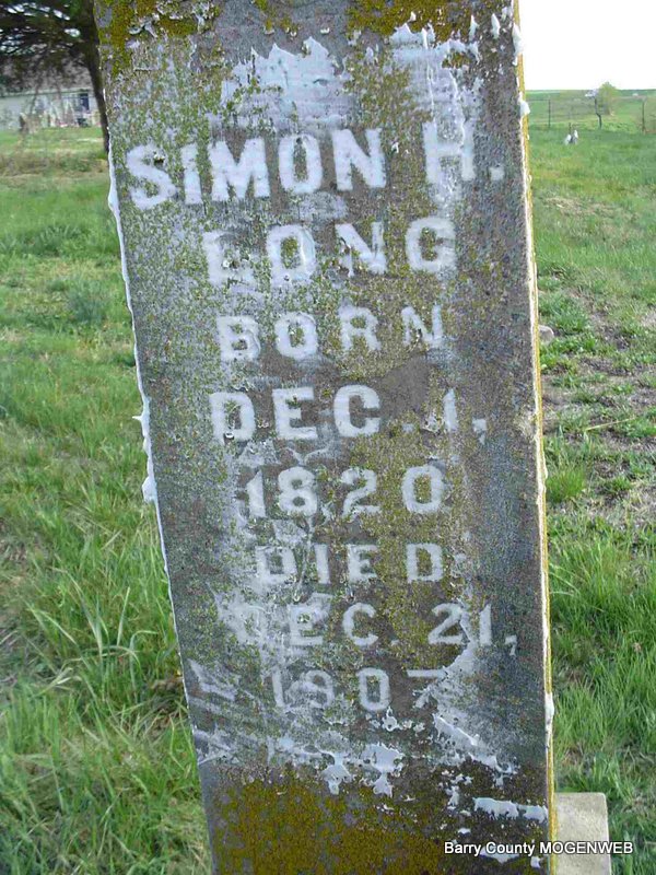 | LONG, Simon Hiram | Dec. 1, 1820 | Dec. 21, 1907 | SSW: Tabitha - Research Note: Son of Hiram and Anna (Lakey) Long. He married Martha Tabitha James, September 25, 1842 in Ozark Co., Missouri. - Goodspeed's History: Simeon H. Long , a farmer and a stock raiser of Barry County, Mo was born in Greene County, Indiana in 1820, and is the second child of Hiram and Anna (Lakey) Long. Hiram was born in East Tennessee on May 20, 1796, and was reared on a farm. He emigrated from his native state to Indiana, and was there married on Feb 11, 1814. His wife was born in Ohio on March 19, 1798. They became the parents of eleven children, four of whom are living. Hiram Long came with his family to Missouri in 1834, locating in Ripley County. He afterward removed to Barry County where he was brutally murdered in 1862. During the Civil War he tried hard to remain with his family in peace, taking no part then in the contest between the North and the South. A band of Southern men came to his home and made inquiry as to his principles. Upon finding him a Union man they took him and one of his sons out and shot them. After the murder of his father and brother, Simeon H. Long enlisted in the Federal army, joining the Eighth Missouri Cavalry, with which he served three years, being mustered out of service at Little Rock, Ark., on July 20, 1865. He was paid off at St. Louis the following August. On September 25, 1842, he was united in marriage with Tabitha James, who was born in Indiana on March 15, 1826. Eleven children have been born to them, seven of whom, Serilda J., Eliza, George W., Franklin H., Samantha C. (Mrs. James Burtchett), U. S. G. and Dora are living. Their eldest son, S. J. Long served in the Civil War in the same company with his father. He died in the hospital at Bloomfield, Stoddard County, MO, from sickness contracted while in the service. After the war Mr. Long returned to the remainder of his family, whom he had left for security at Springfield, MO, and in February, 1866, came to Barry County, where he has since been engaged in farming. He and his wife are consistent members of the Christian Church and the family are highly respected. He is a Republican, and a member of the G.A.R. - Civil War Record | Goodspeed Phyllis Long Note Photo Donna Cooper |
