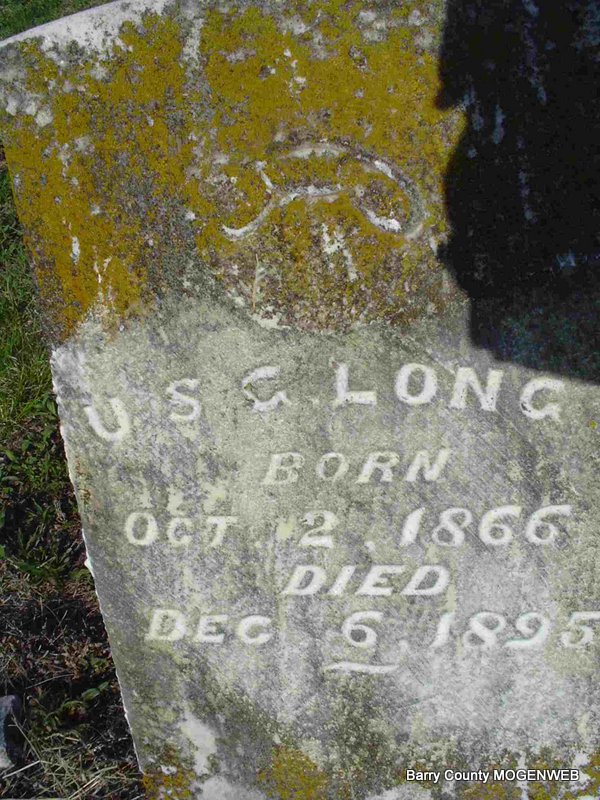 | LONG, U. S. Grant | Oct. 2, 1866 | Dec. 6, 1895 | Research Note: U. S. Grant Long married Augusta Counts in Barry Co., MO, September 5, 1894. He was a son of Simon Hiram and Tabitha (James) Long. | MO Marriage Records Census Phyllis Long Note Photo Donna Cooper |