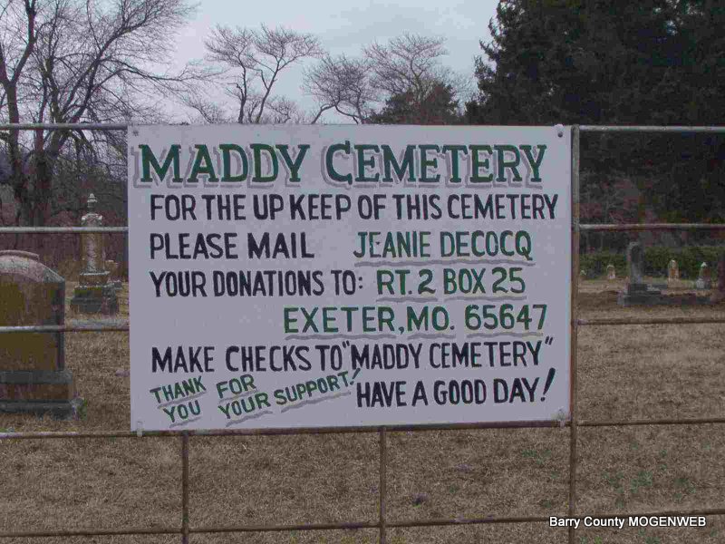 John and Margaret Maddy owned the land that this cemetery is situated on and they are buried here toward the back of the cemetery along with another Maddy family member.