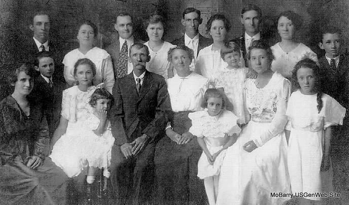 Back Row: L to R: Merton Merivale Meador, Myrtle Thomas Meador, Dr. Ralph W. Hallenbeck, Eleanor (Thomas) Hallenbeck, Hugh S. Brixey, Norma Thomas Brixey, Mack E. McClanahan, Bertha Thomas McClanahan, Curtis Aubrey Thomas. Front Row: L to R: Virginia Thomas Harmon (seated) Carl Eugene Thomas (standing) Bernice Thomas Stubblefield (seated), Maxine McClanahan, Charles Andrew Thomas, Sheriff, Barry Co., MO 1904-1908, Lucinda Josephine (Black) Thomas, Hazel Brixey Stacy, Virginia McClanahan, Cecil Thomas Doane, Montez Brixey Horner Picture taken in 1914. Submitted in 1999 by: Charles H. Williams, Ph.D. |