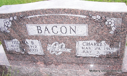 | BACON, Charles Henry | Mar. 29, 1901 | July 3, 1990 | SSW: Thelma B. - Inscription: "Married Sept. 4, 1932" - Research Note: He was the son of Charles Taylor Bacon and Winnie Elizabeth Stater. | Census Phyllis Long Photo Fred and Neoma Sherman |