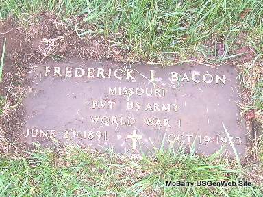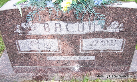 | BACON, Frederick Irvin | June 23, 1891 | Oct. 19, 1973 | SSW: Artie S. - Research Note: He was the son of Charles Taylor Bacon and Winnie Elizabeth Slater. His wife was Artie Stella Hilburn. - Cassville Republican, Nov. 9, 1939 - Mr. and Mrs. Fred Bacon and family of Washburn spent Sunday with Mrs. Leslie Chappell and family. - Military Stone - Inscription: "MISSOURI PVT US ARMY - WORLD WAR I" | Census Online Newspapers Phyllis Long Photo Fred and Neoma Sherman |