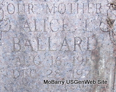 | BALLARD, Alice | Aug. 16, 1918 | Dec. 28, 1979 | Inscription: "Our Mother" | Photos Fred and Neoma Sherman |