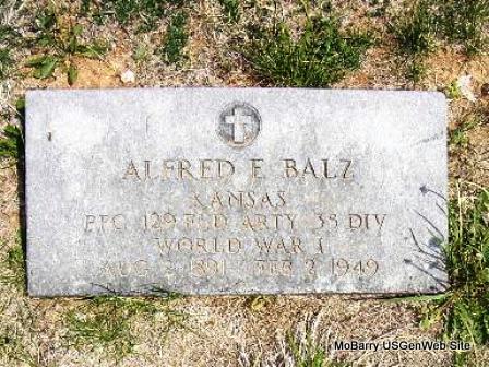 Feb. 2, 1949 | Inscription: "KANSAS 129 FLD ARTY 33 DIV - WORLD WAR I" - Research Note: Son of George Balz and Julia Rasdall. His wife was Bertha. | SS Claims Index Phyllis Long Photos Fred and Neoma Sherman |