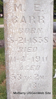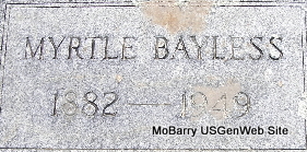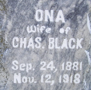 | BLACK, Ona (ERWIN) | Sept. 24, 1881 | Nov. 12, 1918 | Inscription: "Wife of Charles C. Black" - Research Note: Leona "Ona" Erwin was the daughter of William Stewart Erwin and Sephronia (Fronia) Stephens. Ona Erwin, age 19, married Charles C. Black, age 21, on Mar. 24, 1901 in Washburn, Barry Co., MO. | Family Records Census MO Marriage Records Phyllis Long Photo Fred and Neoma Sherman |
