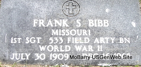 Inscription: "MISSOURI 1ST SGT 533 FIELD ARTY BN - WORLD WAR II" - Research Note: He was the son of John Mount Bibb and Clara Belle Wiles. His wife was Ruth of Wichita, KS and she was the informant on the death certificate. They lived at 2126 S. Ash in Wichita, Sedgwick Co., KS. Cause of death was suicide. He placed a hose in the exhaust system and ran inside of the car. | Census Death Certificate Phyllis Long Photo Fred and Neoma Sherman |