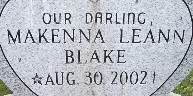 | BLAKE, Makenna Leann | No Date | Aug. 30, 2002 | Inscription: "Our Darling" - Research Note: Infant daughter of Laurie K. Berry and David M. Blake. She was preceded in death by her maternal great grandparents, John and Dorothy Moore and Harry Homrighous; and maternal great grandparents, Delmar and Betty Berry. | Wheaton Funeral Home Phyllis Long Photo Fred and Neoma Sherman |