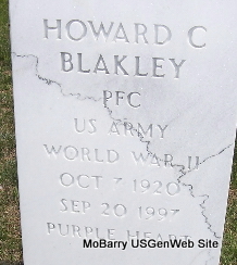 Inscription: "US ARMY - WORLD WAR II, PURPLE HEART" - Research Note: He married Mildred Yarnall on Nov. 24, 1945, at Independence, Kansas. Arrangements were under the direction of Williamson Funeral Home, Cassville. Son of Gifford E. Blakley and Josie Abel. | Obituary Linda Garrett SS Claims Index Phyllis Long Photo Fred and Neoma Sherman |