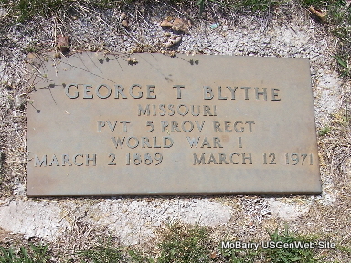 SSW: Olivia P. - Research Note: Rural Washburn, Barry Co., MO resident. He married first Clara Bolin. Probably died due to child birth. They had a son George and he is with George and Olivia in the 1930 census, age 7. He second married Olivia P. Bradley. Son of Samuel Wilson Blythe and Harriet Sylvania Brock. His wife Olivia was the informant on the death certificate. - January 17, 1918, Cassville Republican - George Blythe, son of Mr. and Mrs. Sam Blythe, enjoyed New Years at home. He has been at Camp Funston since Sept. 20. He said he had gained 41 pounds in weight since he left. - February 21, 1918, Thursday, Cassville Republican - Sam Blythe and son, Cleve, and two daughters of Flat Creek post office came to Cassville Friday and took the evening train for Camp Funston to visit their son and brother, George Blythe. In a letter received from George last week he expressed himself as believing that he would leave the camp soon and they wanted to visit him before he was transferred. - Military Stone - Inscription - "Missouri, PVT 5 Prov Rect, World War I" | Headstone Beverly Matthews Census Online Newspapers Death Certificate Phyllis Long Photo Fred and Neoma Sherman |