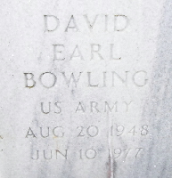 | BOWLING, David Earl | Aug. 20, 1948 | June 10, 1977 | Inscription: "US ARMY" - Research Note: Son of Earl Sanford Bowling and Marjorie Mary Robbins. | My Dad Rebecca Smith Photo Fred and Neoma Sherman |