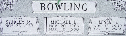 | BOWLING, Michael L. | Nov. 20, 1965 | Mar. 12, 1980 | SSW: Shirley and Leslie J. - Inscription: "Son" - Research Note: He was the son of Leslie James Bowling and Shirley M. Herndon. | Note Phyllis Long Photo Fred and Neoma Sherman |