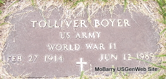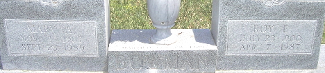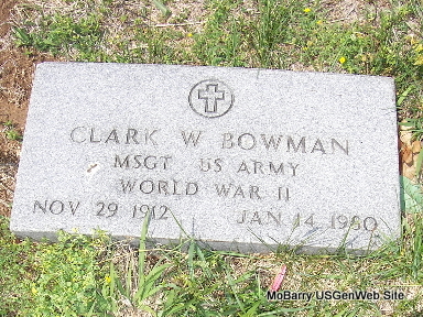 | BOWMAN, Clark Wilson "Willie" | Nov. 29, 1912 | Jan. 14, 1980 | Inscription: "MSGT US ARMY -WORLD WAR II" - Research Note: Son of Edgar O. Bowman and Bessie Austin. | Census Phyllis Long Photo Fred and Neoma Sherman |