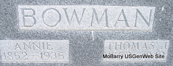 SSW: Thomas J. - Research Note: Death certificate has parents Thomas Featherstun born IL and Helen Randall. According to census, she was the daughter of William S. Featherston and Margaret Pressgrove, both buried at Concord Cemetery. T. J. Bowman of Exeter, Barry Co., MO was the informant on the death certificate. Annie Featherston married Thomas J. Bowman on Oct. 26, 1879 in Barry Co., MO. | Death Certificate Census MO Marriage Records Phyllis Long Photo Fred and Neoma Sherman |