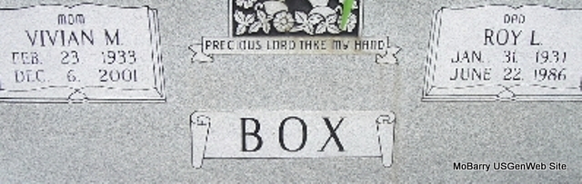 SSW: Earl Sanford - Inscription: "Married August 7, 1945" - Research Note: Stone has no death date. Daughter of Roxie and Opal W. (May) Robbins, married Earl Bowling on August 7, 1945, and he preceded her in death in December of 1987. She lived most of her life in Barry County and had been employed with the Exeter School District for 10 years. She was preceded in death by one son, David, in 1977; three brothers and two sisters. | Monett Times Dec. 13, 2000 Mary Homesley Photo Fred and Neoma Sherman |