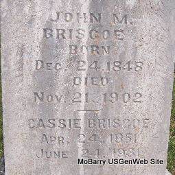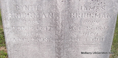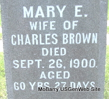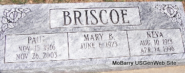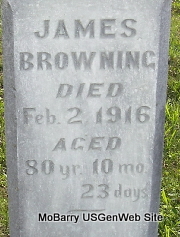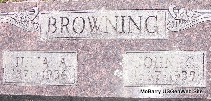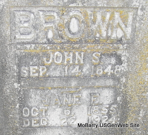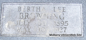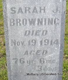 Inscription: "Age 76 yr, 6 mo, 3 days" - Research Note: Wife of James Browning. According to her death certificate she was married and a daughter of John Bryant and Rhoda Burns, both born TN. C. S. Browning of Exeter, Barry Co., MO was the informant. Her husband was James Browning. - September 23, 1905, Saturday, Cassville Democrat - Mrs. Bryant, (Sarah's mother) mother-in-law of James Browning of near Exeter, died Tuesday night. She was nearly 85 years old. The remains were laid to rest in the New Site Cemetery, Thursday afternoon. Mrs. Bryant was an old and highly respected citizen of the county. | Death Certificate Phyllis Long Photo Fred and Neoma Sherman |
