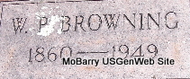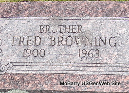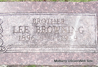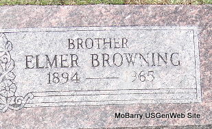 Inscription: "Brother" - Research Note: William Elmer was the son of William Grant Browning and Annie Elizabeth Spahr. Never married. He was found dead in bed, apparently a heart attack. Ralph Browning of Cassville, MO was the informant on the death certificate. He was a retired farmer. Still single in the 1940 census, living with his mother and brother Lee. | Mother's Obit Census Death Certificate Phyllis Long Photo Fred and Neoma Sherman |