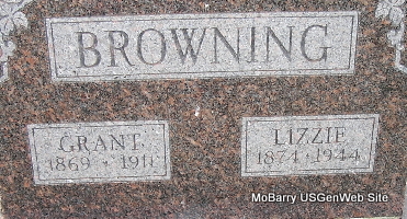 SSW: Lizzie - Research Note: Cassville Republican, January 19, 1911 - Exeter News: Grant Browning died at his home north of town one mile, Friday, a.m., aged about 40 years. He had been sick for quite a while with a complication of diseases. Funeral services were held at the Baptist Church, Saturday p. m. by Rev. C. M. Smith and interment made in Maplewood Cemetery. He leaves a wife and five children and was a son of Jas. Browning of this place. Full name on the death certificate is William Grant Browning. He was married and a farmer. He was a son of James Browning, born KY, and Sarah J. Bryant, born TN. C. S. Browning of Exeter, MO was the informant. Cause of death was unknown. His wife was Annie Elizabeth "Lizzie" Spahr. | Online Obit Death Certificate Phyllis Long Photo Fred and Neoma Sherman |