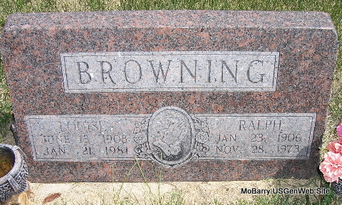 | BROWNING, Ralph George | Jan. 23, 1906 | Nov. 28, 1973 | SSW: Louise - Research Note: He was the son of William Grant Browning and Annie Elizabeth Spahr. | Census Mother's Obit Phyllis Long Photo Fred and Neoma Sherman |