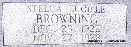 | BROWNING, Stella Lucille | Dec. 23, 1922 | Nov. 27, 1928 | Research Note: She was the daughter of James Arthur Browning and Bertha Bales. | Note Phyllis Long Photo Fred and Neoma Sherman |