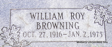 | BROWNING, William Roy | Oct. 27, 1916 | Jan. 2, 1975 | Research Note: Son of James A. Browning and Bertha Lee Bales. | Census Phyllis Long Photo Fred and Neoma Sherman |
