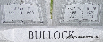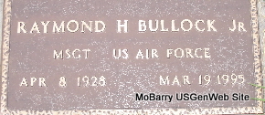 | BULLOCK, Raymond Howell, Jr. | Apr. 8, 1928 | Mar. 19, 1995 | SSW: Audrey D. Bullock - Research Note: Raymond Howell Bullock, Jr. son of Raymond H. Bullock and Mary Lena Jackson. Married Audrey Delores McConnell May 16, 1960. - Military Stone - Inscription: "Raymond H. Bullock, Jr. MSGT US Air Force- Apr. 8, 1928 - Mar. 19, 1995" | Headstone Note Norman Smith Photo Fred and Neoma Sherman |