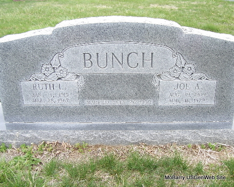 SSW: Joe A. - Inscription: "Married July 26, 1930" - Research Note: Daughter of James E. and Lydia (Peterson) Howe. Her husband Joe was the informant on the death certificate. They lived at RR One, Exeter, MO. Joe A. Bunch, age 21 of Berryville, Carroll Co., AR, married Ruth Lois Howe, age 15 of Berryville, Carroll Co., AR, on July 26, 1930 in Carroll Co., AR - 1930 Census, Polo, Carroll, Arkansas - James E. Howe born WI age 47; Lydia Howe age 41 born WI; Ruth age 15; Earl age 14; Jay age 11; Lucille age 9; Jeff age 7; Mable age 3. | AR Marriage Records Census Death Certificate Phyllis Long Photo Fred and Neoma Sherman |