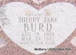 | BURD, Sherry Jane | Aug. 9, 1960 | Mar. 29, 1981 | Inscription: "Wife of Tom Burd" | Photo Fred and Neoma Sherman |