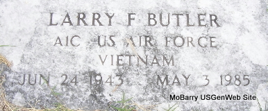May 3, 1985 | Inscription: "AIC US AIR FORCE VIETNAM" - Research Note: Larry Fenton Butler, age 27, married Linda Case, age 19, on May 27, 1972 in Saginaw, Newton Co., MO. Larry Fenton Butler, age 40, married Mary Caroline Charney, age 32, on Sept. 7, 1984 in Milwaukee, WI. There is a listing on OH births for Larry Butler born June 24, 1942. SS Claims Index says he was born in Shell Knob. Might be different Larry's. Son of Elmer Fenton Butler and Hilma Epperly. Larry's sister, Mona Crass, is buried at Clio Cemetery. He is named as preceding her in death. His parents are also buried at Clio Cemetery. | Census MO Marriage Records WI Marriage Records OH Birth Records SS Claims Index Phyllis Long Photo Fred and Neoma Sherman |