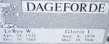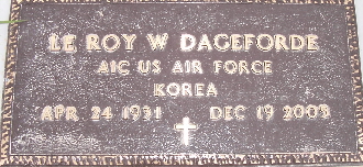 SSW: Gloria L. - Research Note: Son of Walter Dageforge and Emma Dierking. On Jan. 4, 1952, he was united in marriage to Gloria Vignery. He was preceded in death by his parents and one brother, Ralph Dageforde. He received his education in Kansas, where he graduated from high school. He served his country in the United States Air Force and then became an electrician for the Federal Civil Service, from which he retired in 1987. In 1990 he moved to Exeter to make his home and where he and Gloria celebrated their 50th wedding anniversary three years ago. He was a member of Holy Cross Lutheran Church and the American Legion Post 118. Cremation arrangements were under direction of Fohn Funeral Home, Cassville. Memorial services will be held at a later date. - Military Stone - Inscription: "AIC AIR FORCE KOREA" | Fohn Funeral Home SS Claims Index Phyllis Long Photo Fred and Neoma Sherman |