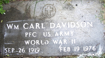 | DAVIDSON, William Carl | Sept. 26, 1919 | Feb. 19, 1976 | Inscription: "PFC US ARMY WORLD WAR II" - Research Note: He was the son of William Elbert and Lela Davidson. | Census Phyllis Long Headstone Cheryl Photo Fred and Neoma Sherman |