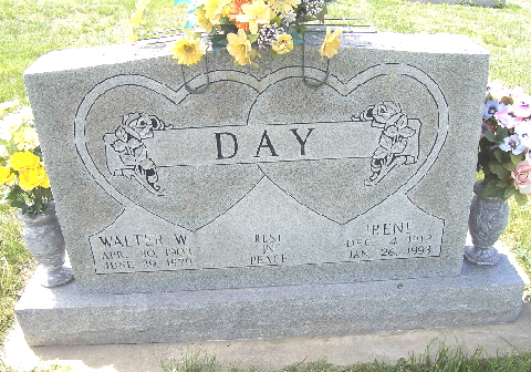 | DAY, Irene (TOWNSEND) | Dec. 4, 1912 | Jan. 26, 1999 | SSW: Walter W. - Given name was Esta Irene. She was the daughter of Carroll Townsend and Elizabeth Packard. | Family History by J. D. Day Phyllis Long Photo Fred and Neoma Sherman |