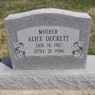 June 21, 1996 | Inscription:"Mother" - Research Note: She was the wife of Homer Duckett. Daughter of John R. May and Mattie R. Mullins. | Census SS Claims Index Phyllis Long Photo Fred and Neoma Sherman |