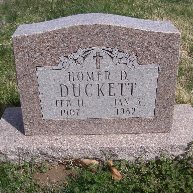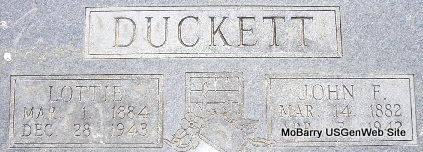 | DUCKETT, Homer Downs | Feb. 11, 1907 | Jan. 5, 1982 | Research Note: He was the son of Robert Adison Duckett and Pheby Ann Scroggins. Wife was Alice May. Homer Downs Duckett, age 67, second married Jessie Tucker, age 44, on May 7, 1975 in Purdy, Barry Co., MO. | Census MO Marriage Records Phyllis Long Photo Fred and Neoma Sherman |