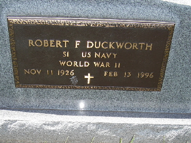 Feb. 13, 1996 | SSW: Mary Lou - Research Note: Son of Albert L. Duckworth and Ruth G. Humfeld. Robert Francis Duckworth, age 21 from Bremerton, Kitsap Co., WA, married Mary Lou Yarnall, age 18 from Cassville, Barry Co., MO, on Mar. 28, 1945 in Washington Co., AR. - Military Stone - Inscription:"SI US NAVY WORLD WAR II" | SS Claims Index AR Marriage Index Phyllis Long Photo Fred and Neoma Sherman |
