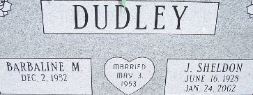 SSW: J. Sheldon - Inscription: "Married May 3,1953" - Research Note: She was the daughter of Wilton D. and E. Marie (Pearson) Mathews. On May 3, 1953, she was united in marriage to Sheldon Dudley, who preceded her in death on January 24, 2002. Also preceding her in death were her parents and one daughter, Julie Dudley Gates. Barbaline grew up and received her education in Kansas, graduating from high school in Parker, Kansas. In 1964, she moved from Kansas to Missouri and in June, 1969, she moved to Exeter, Missouri. For several years she helped her husband, Sheldon, in the bank at Exeter. After that, she worked as a secretary and librarian for the Exeter School. | Fohn Funeral Home Phyllis Long Photo Fred and Neoma Sherman |
