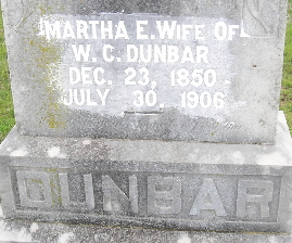 Inscription: "Wife of W. C. Dunbar" - Research Note: She was the daughter of Joseph Eaton and Mary P. Underhill. - Cassville Democrat, August 4, 1906 - Mrs. Wm. C. Dunbar of Exeter died Monday morning of congestion of the stomach, age 56 years. She had been married 36 years and is said to have been a good citizen. The remains were buried at Exeter. | Census Online Obit Phyllis Long Photo Fred and Neoma Sherman |