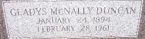 | DUNCAN, Gladys (McNALLY) | Jan. 24, 1894 | Feb. 28, 1961 | Research Note: Gladys McNally, age 21, married Floyd A. Duncan, age 21, on May 2, 1915 in Barry Co., MO. She was the daughter of Charles McNally and Emma Bayless. | MO Marriage Records Census Phyllis Long Photo Fred and Neoma Sherman |