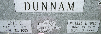 | DUNNAM, Willie Lee "Bill" | June 15, 1919 | Nov. 3, 1998 | SSW: Lois C. - Inscription: "Married July 7,1945" - Research Note: He was a WW II veteran, "M.Sgt., U.s. Air Force, WW II, Korea". He married Lois Goostree on July 7, 1945 in Benton Co., AR. He was the son of Lee Fitzhugh Dunnam and Maude Elizabeth Hunsinger. Photos of Willie and Lois at findagrave.com. | AR Marriage Index Phyllis Long Photos Fred and Neoma Sherman |
