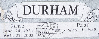 SSW: June - Inscription: "Married Sept. 2, 1956" - Research Note: Charles Paul Durham passed away at his son's home in Marshfield, MO at the age of 77 years, 4 months and 3 days. He was formerly from Jefferson City, MO. He was married to June May on Sept. 2, 1956, in Pittsfield, Ill. To this union, two sons and a daughter were born. Son of Virgil Durham and Margaret E. Duffield. | The Marshfield Mail SS Claims Index Phyllis Long Photos Fred and Neoma Sherman |