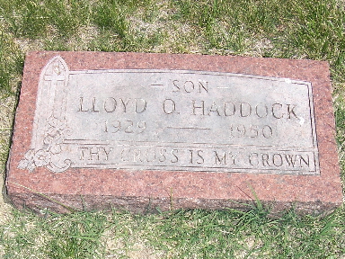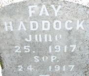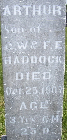 | HADDOCK, Arthur | Mar. 30, 1904 | Oct. 25, 1907 | Inscription: "Son of C. W. and F. E. - Aged 3 Y, 6 M, 25 D" - Research Note: He was the son of Charles William Haddock and Florence Moore. | Note Donna Cooper Photo Fred and Neoma Sherman |