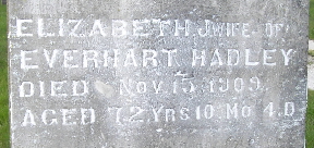Inscription: "Wife of Everhart Hadley - Aged of 72 Yrs. 10 Mo 4 D" - Research Note: Elizabeth Jane Hadley was born in Tennessee February 11, 1837. When but a child she came with her parents to Barry County which has since been her home. She was twice married. Her second husband was Everhart Hadley, a well known citizen of this county, who died in 1894. To them were born six children all of whom are living and were at the funeral. The children are: Mrs. Price Stapleton, Thomas Hadley and Miss Lottie of Exeter, C.H. Hadley of this city, Leonard of Ardmore Okla., and Charles of Denison, Tex. Everhart died May 10, 1894 and his remains were laid to rest in the family graveyard (Henry Hadley Cemetery) on the old home place. Research Note by Dar Randall: Elizabeth Jane Hadley was married to my 5th great grandfather, Evehart Hadley. He was married twice as well. Elizabeth Jane Hadley was married to Thomas H. Dilworth. Mr. Dilworth was killed in Cassville by Union soldiers during the war. He is mentioned in Goodspeed's History. Elizabeth Jane was the daughter of Lawrence Bradley and Sarah Green. | Online Obit Phyllis Long Note Dar Randall Photo Fred and Neoma Sherman |