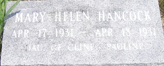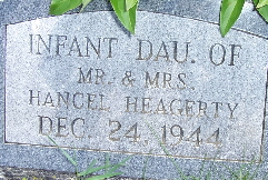 | HEAGERTY, Infant | No Date | Dec. 24, 1944 | Inscription: "Infant Dau. of Mr. and Mrs. Hancel Heagerty" | Photo Fred and Neoma Sherman |